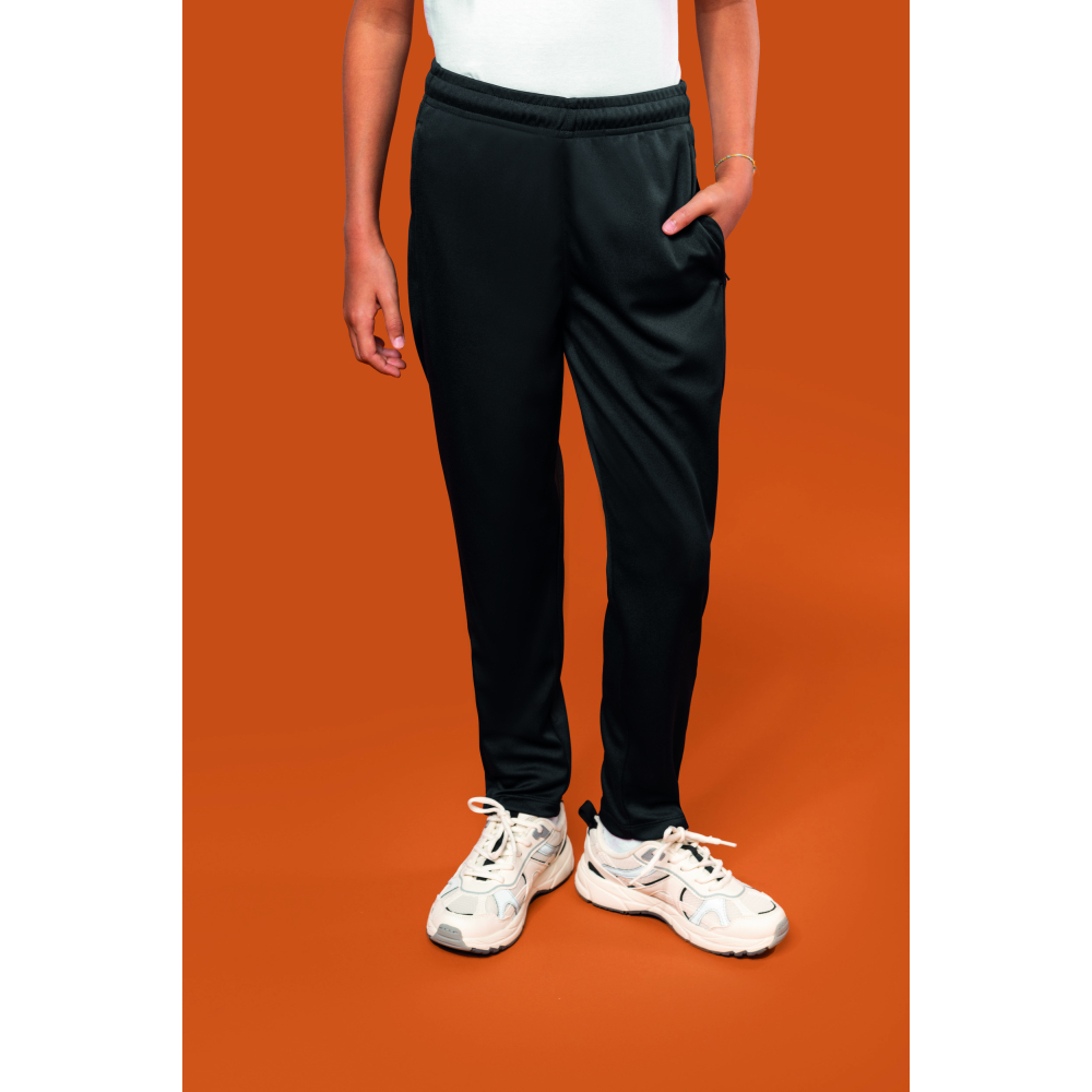 100% mat interlockpolyester. Slim snit. 2 ritszakken opzij.